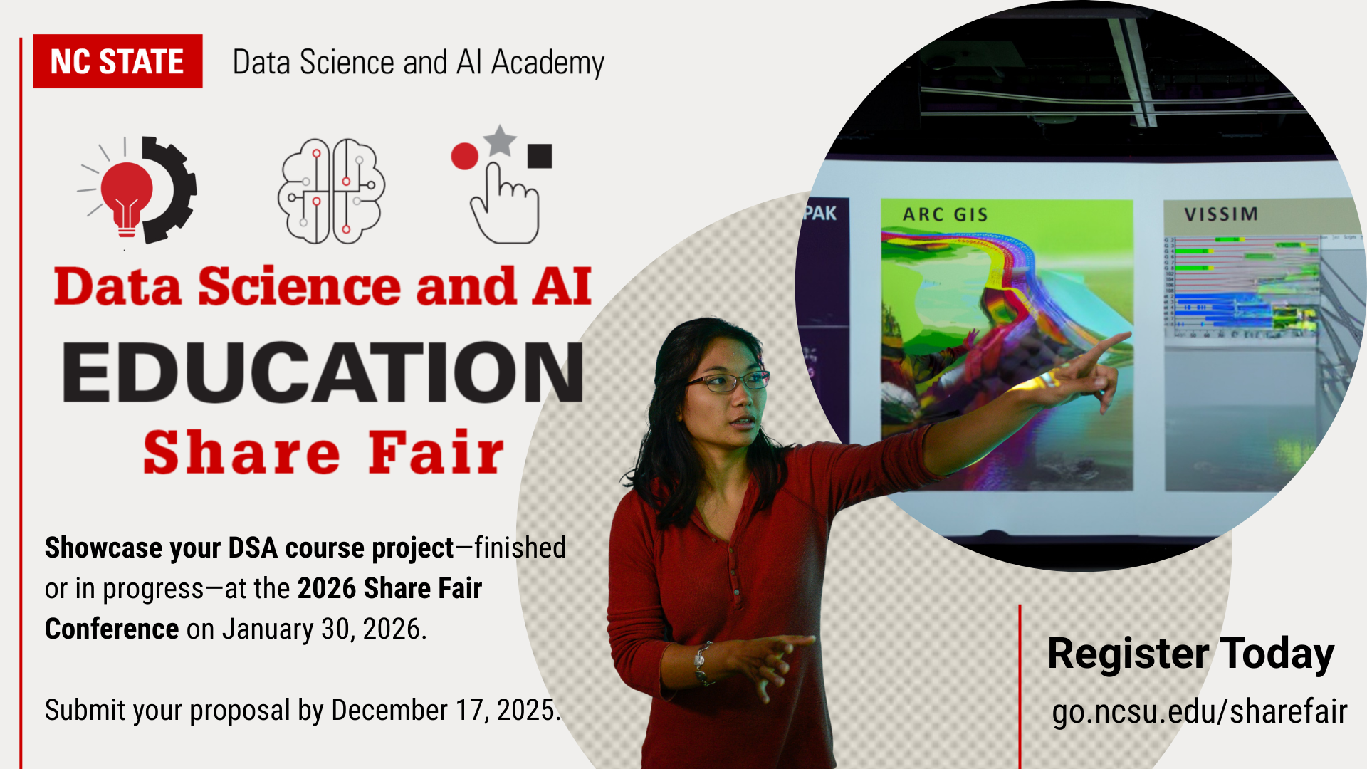 The following slides are being displayed on the screen located at DH Hill Library - Outside of Suite 2144 Data Science and AI Academy.